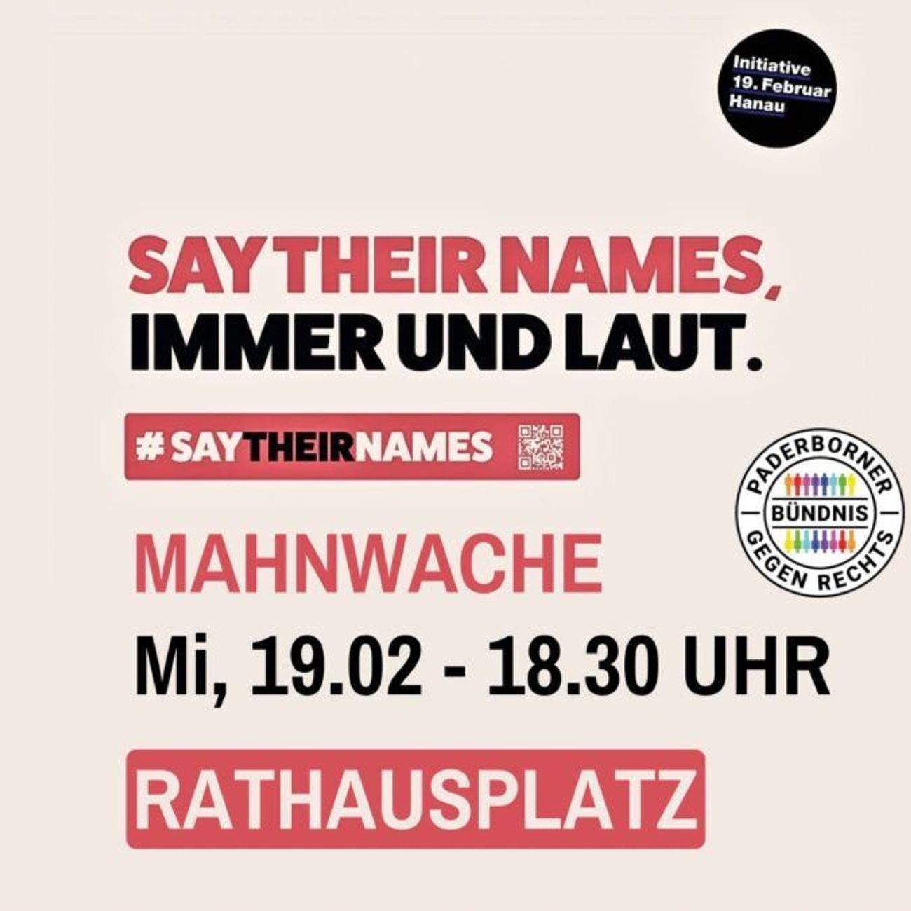Wir wollen uns den unzähligen deutschlandweiten Gedenkveranstaltungen anschließen, um den Opfern zu gedenken. Kommt am Mittwoch, 19.02. um 18.30 Uhr zum Rathausplatz, Paderborn.